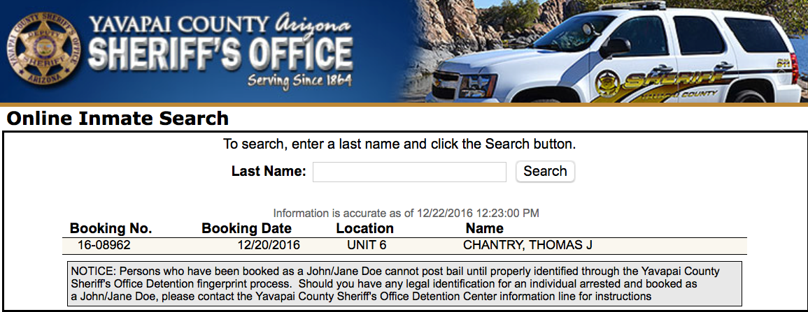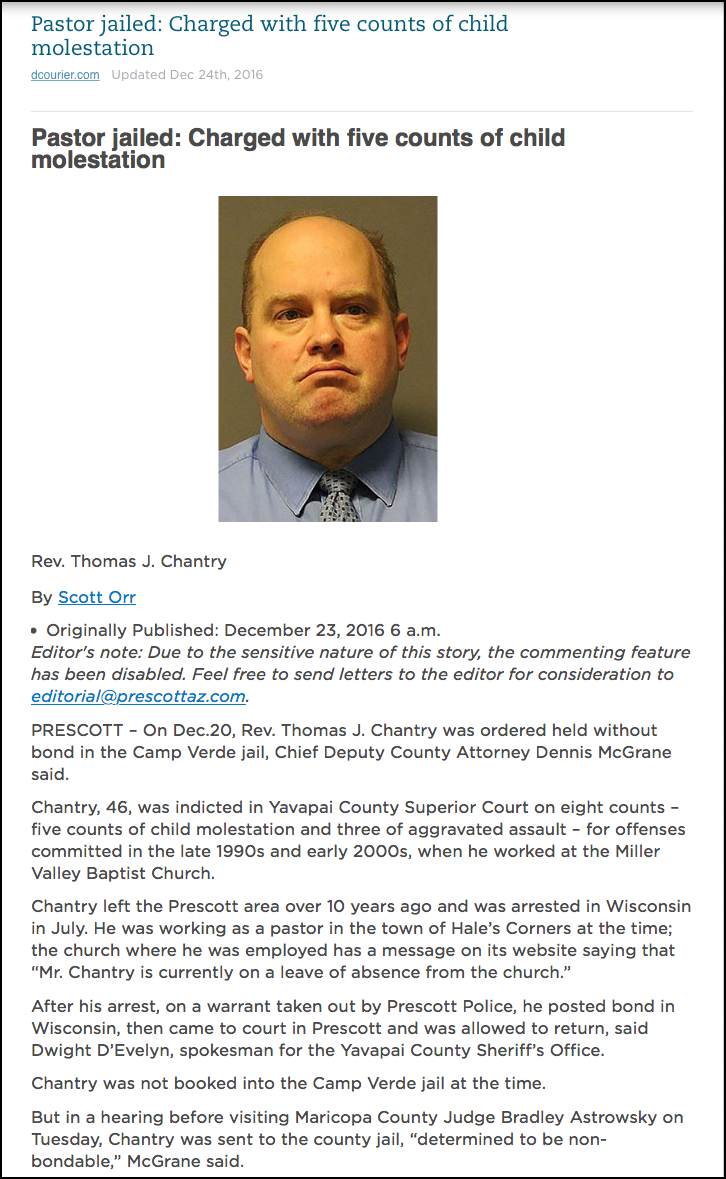 Tom Chantry was in court on December 16, 2016; four days later he was locked up in the Yavapai County jail located in Camp Verde, Arizona. Chantry has been indicted on five counts of molestation of a child and three counts of aggravated assault with serious injury.