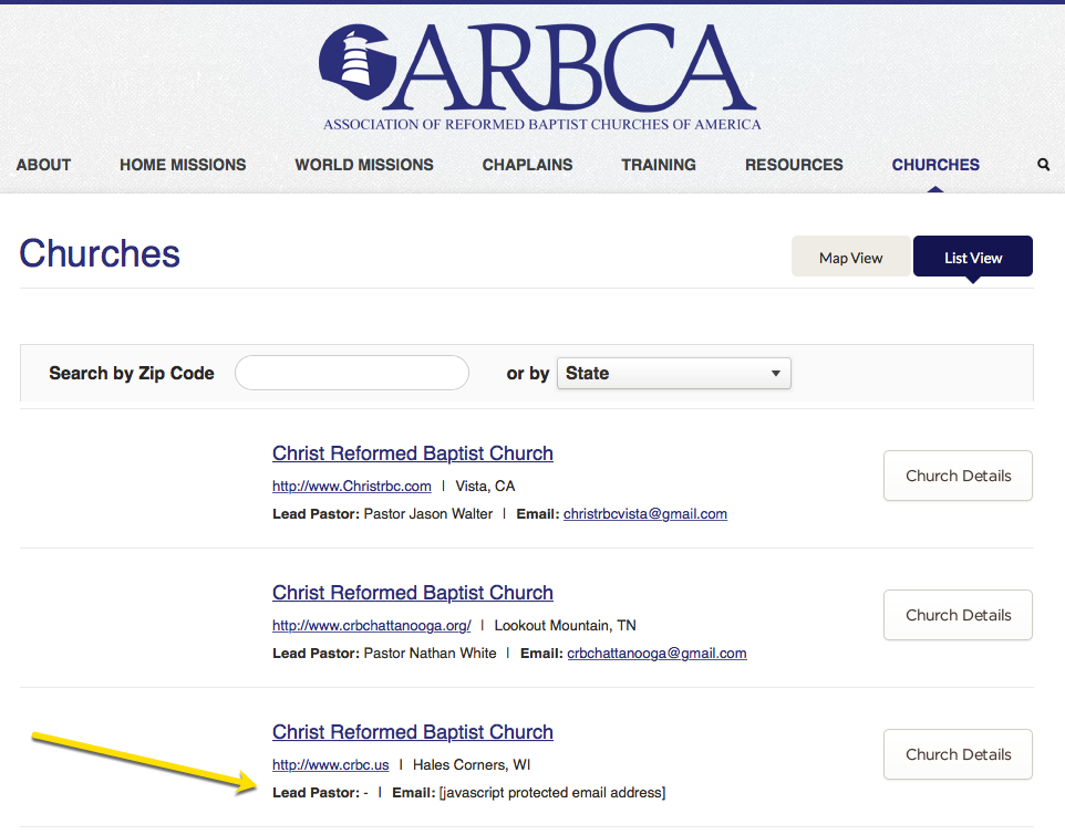 Chantry was the pastor at Christ Reformed Baptist Church in Hales Corners, WI. The church website still shows Chantry on a leave of absence. The church is a member of the Association of Reformed Baptist Churches of America (ARBCA). The ARBCA has scrubbed Chantry’s name from their website.