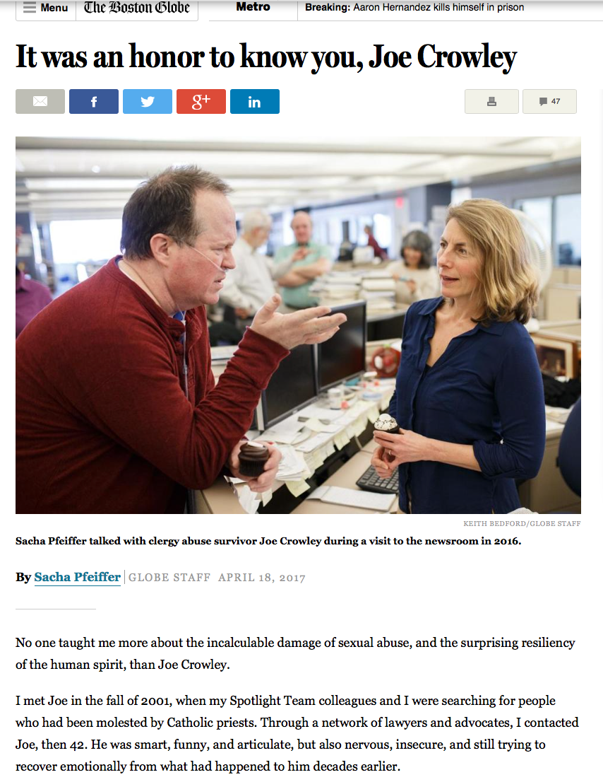Sacha Pfeiffer, one of the Boston Globe “Spotlight” journalists who broke the huge story of Catholic Clergy Abuse, has written a moving story about Joe Crowley. Crowley was one of the subjects of the Spotlight film; he died on Easter Sunday.