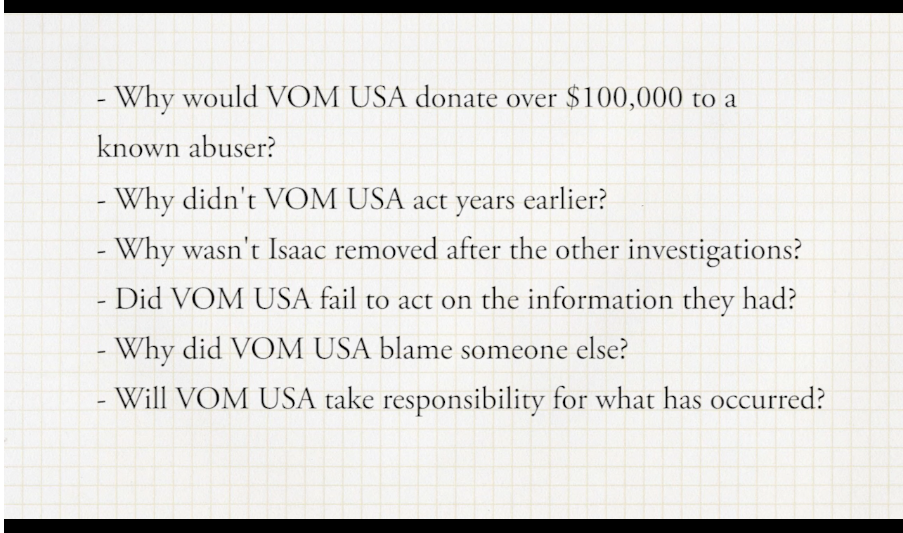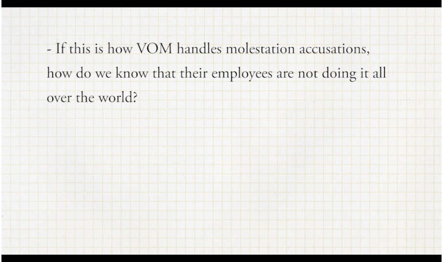 “After I brought all of these facts to light, I was asked also to keep quiet, not to rock the boat. Before being laid off I was offered substantial contractual financial incentives not to “badmouth” VOM. Some of the organizations endorsing Voice of the Martyrs have interrelated employees and interests. When I approached them, they were shy and sore afraid for their own interests to insist my letter be answered. Some pathetic answers like: “Do not cast the first stone,” “king Solomon made mistakes ,” “we might also sin” or “promise to keep correspondence private only” displayed the hypocrisy to protect the flow of donations rather than any interest in protecting possible children victims! Some answers were outright sarcastic, as if my requesting a proper investigation regarding suspected pedophilia among “Christian missionaries” would be some joke.”