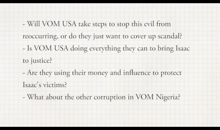 Hello Todd,I am writing to you, because I am hoping you will be able to help us expose this evil situation that is going on in Nigeria. A group visiting there for ministry from our church was told of a very sad situation where the girls in an orphanage that Voice of the Martyrs runs in Nigeria (the Stephens Center) were being abused by their staff.The director: Isaac Newton, has habitually abused the girls, and then has taken them to have their babies aborted, and one of the girls has even had to have her womb removed.Other than the sexual abuse that goes on, the children are not fed or provided for adequately – and VOM has advertised this Orphanage and raised money for it!Isaac Newton is now trying to cover up and discredit us, so that he can continue in his wicked ways. He has threatened the girls he has abused not to speak up, and also his former employees who blew the whistle on him.We’ve spent the last year fighting to get justice for these girls and to get VOM to stop the evil and make sure it never happens again. We have been in lengthy contact with members from them, sending all the board members the video well before we released it last week. We contacted Richard Wurmbrand, the founder’s son, (Editors note: they actually contacted Michael Wurmbrand, Richard’s son.) and he has told us that VOM is fully corrupt and will not deal with it.So far he seems to be right, they have shown themselves to be more interested in covering up the scandal than doing the right thing. They told us they defunded him, but then gave him $100,000 worth of property and materials. So now we’re trying to shine the light of truth on this darkness. Would you help us by making this video more available to the public and asking people to sign the petition that we’ve created, calling VOM to do an outside investigation, and be open about what went on there?We have put together a video and website persecutingthepersecuted.com.Thank you very much,Andrea Horn from Reformation Baptist Church