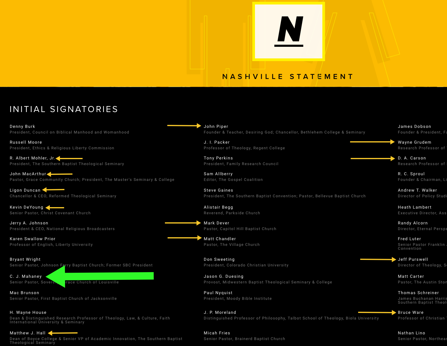 Now the Ethics & Religious Liberty Commission and the Council on Biblical Manhood and Womanhood have sponsored a group which has published the Nashville Statement. Among the Initial Signatories are numerous Christian celebrities who fall into one or more of the categories I listed in the previous paragraph. I have highlighted their names in a screen shot below.