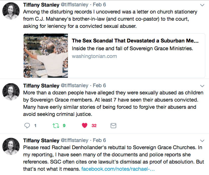 On February 13, 2018 Sovereign Grace Churches, undoubtedly reacting to intense heat from the comments Rachael Denhollander made about them, issued its second statement in 11 days. Published on its national website, it was no doubt an attempt to reassure their friends that all is well in Sovereign Grace. Indeed, the usual cast of Mahaney supporters quickly tweeted out their postive responses. Birds of a feather flock together.