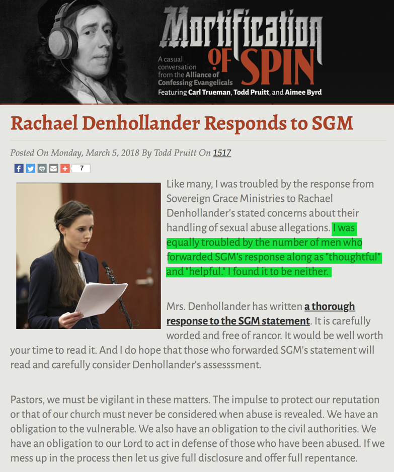 Having said that, the decisions of Rachael and others to publicly pronounce SGC and its pastors guilty of sexual abuse and conspiracy, on the basis of false allegations and with no direct knowledge of SGC’s history or the facts, have profoundly damaged the reputations and gospel ministries of innocent pastors and churches. The comparisons drawn between SGC and horrific, widespread episodes of abuse—about which the facts are already publicly established – are irresponsible.