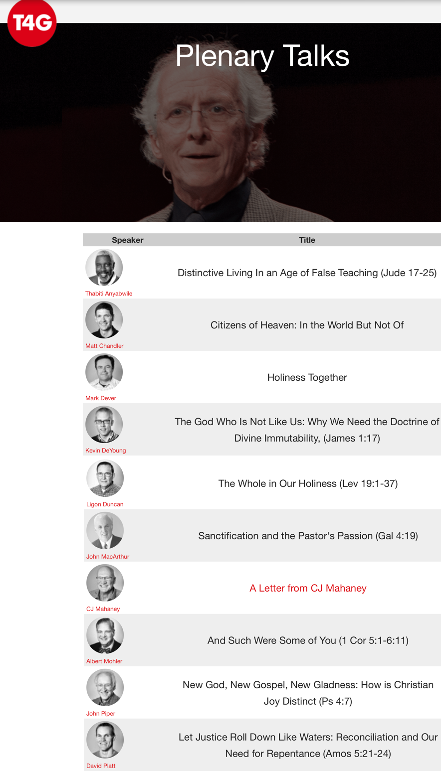 CJ Mahaney has withdrawn from the 2018 T4G conference. This due in large part from the spotlight Rachael Denhollander has shined on Sovereign Grace Churches (SGC, formerly Sovereign Grace Ministries (SGM)). Additional heat was applied by The Washington Post and Fox television, among others.