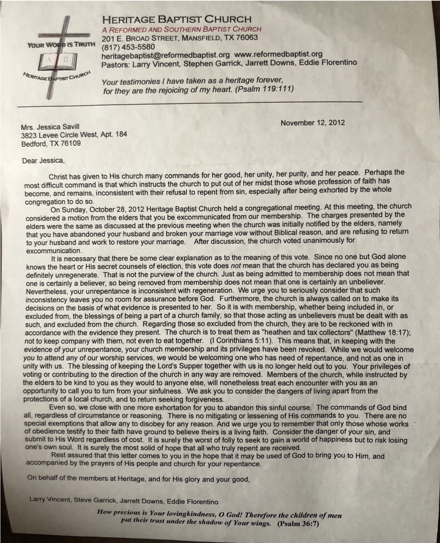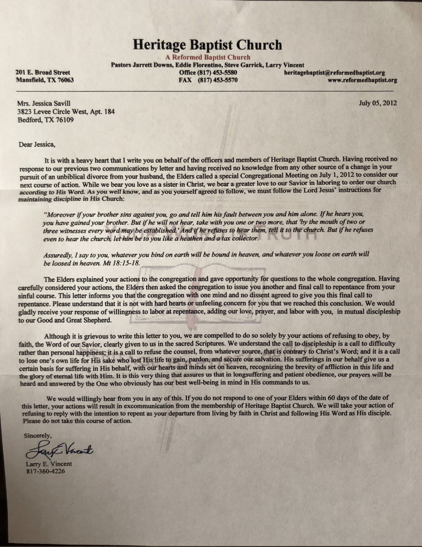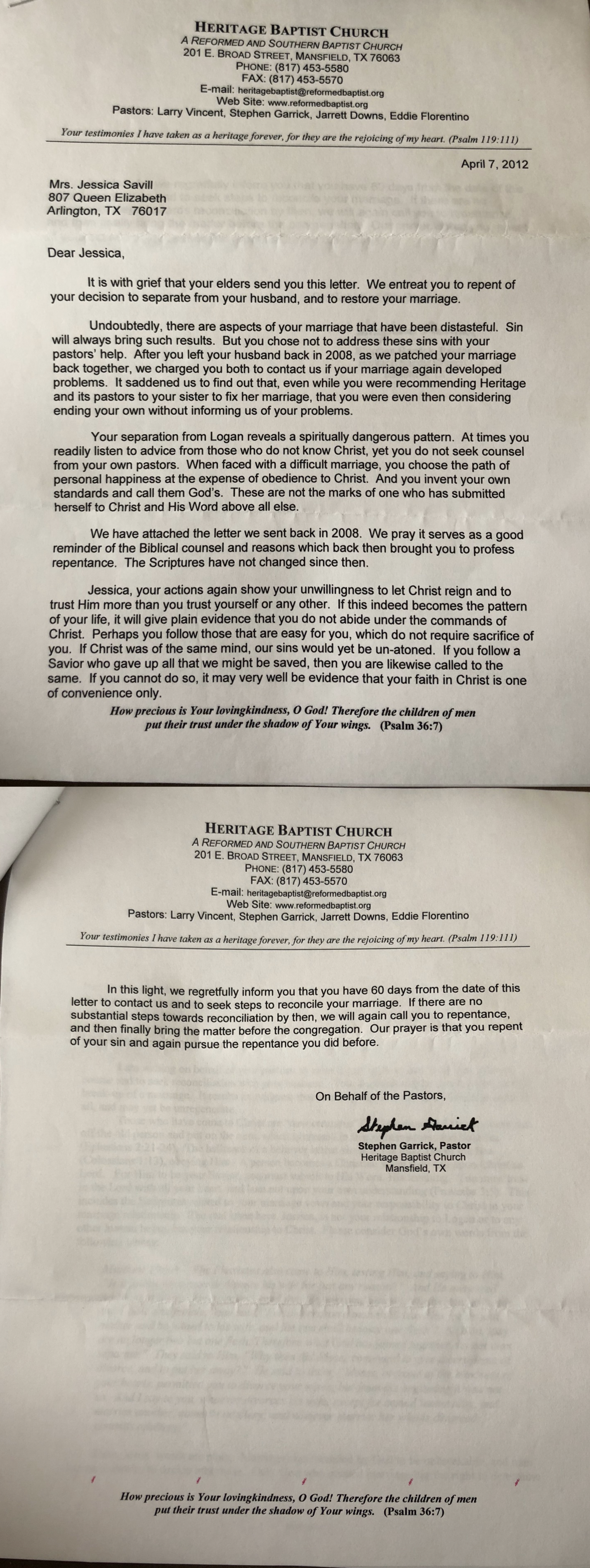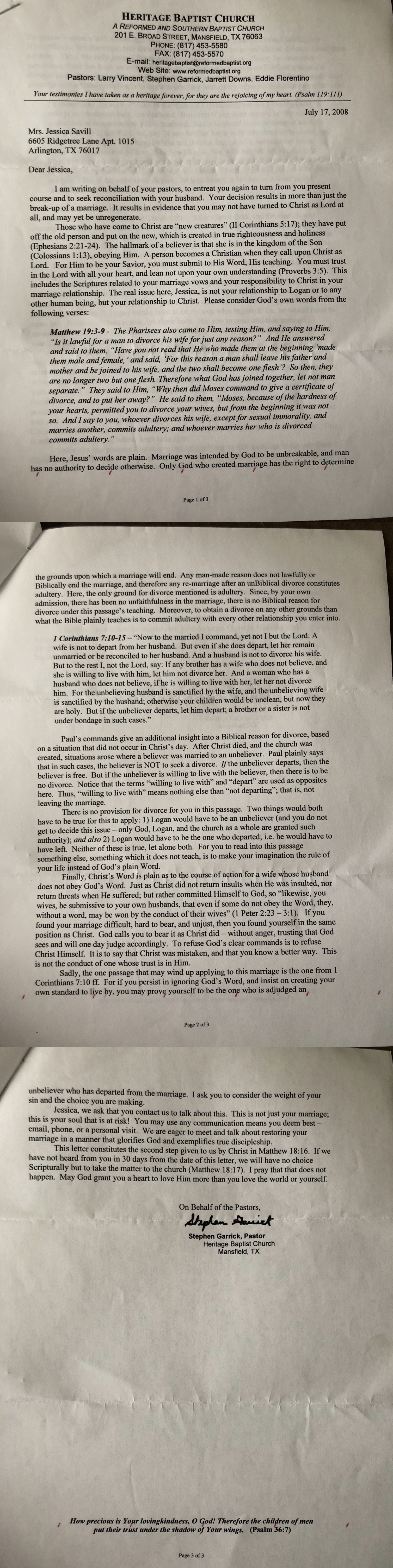 Jessica shared the letters she received from the pastors of Heritage Baptist while she was going through this extremely turbulent time in her life. She has given me permission to post them here. She also shared some correspondence she had with her father from the same time period. While she said I could post them, I have chosen not to. Her parents remain members of Heritage Baptist church and it appears their relationship with Amanda, Jessica, and one brother are severely strained. While the father’s correspondence allows a fascinating glimpse into the mindset of a loyal Heritage Baptist member, it is my prayer that someday Jessica’s parents will be reconciled with their children.
