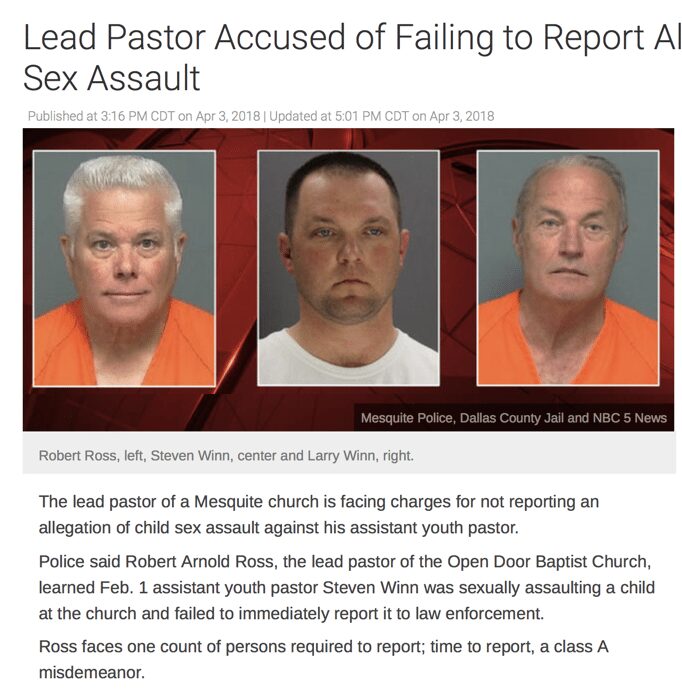 Marybeth Arnold and Amanda Hodson both allege that they were sexually abused by Ben Cole. All three of them attended Heritage Baptist Church. Marybeth Arnold and Amanda Hodson were juveniles, Ben Cole had reached the age of majority. The pastors at Heritage Baptist Church became aware of the sexual abuse and did not inform Law Enforcement. In the state of Texas, that is a crime and Texas takes it seriously, as you can see from the article below.