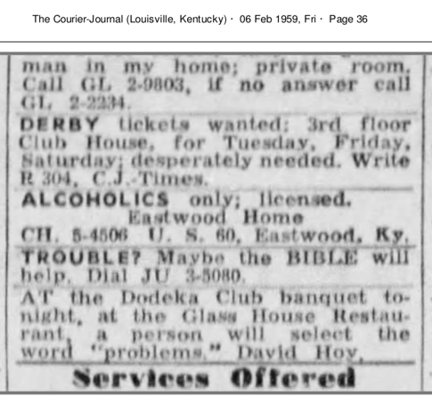 What did take place at those Dodeka meetings? It’s hard to say without the testimony of an actual member. One interesting thing my blog partner, Janna found was the cryptic add below placed in the Louisville newspaper in 1959.