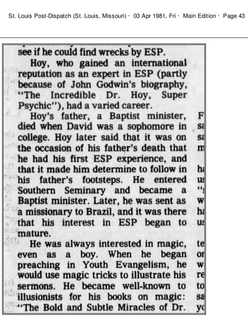 I really do not know what to make of the add. David Hoy was at one time a student at Bob Jones University and Southern Seminary. After his schooling there he completely shed any vestiges of Christianity and became involved in the occult. Below is some information about Hoy.