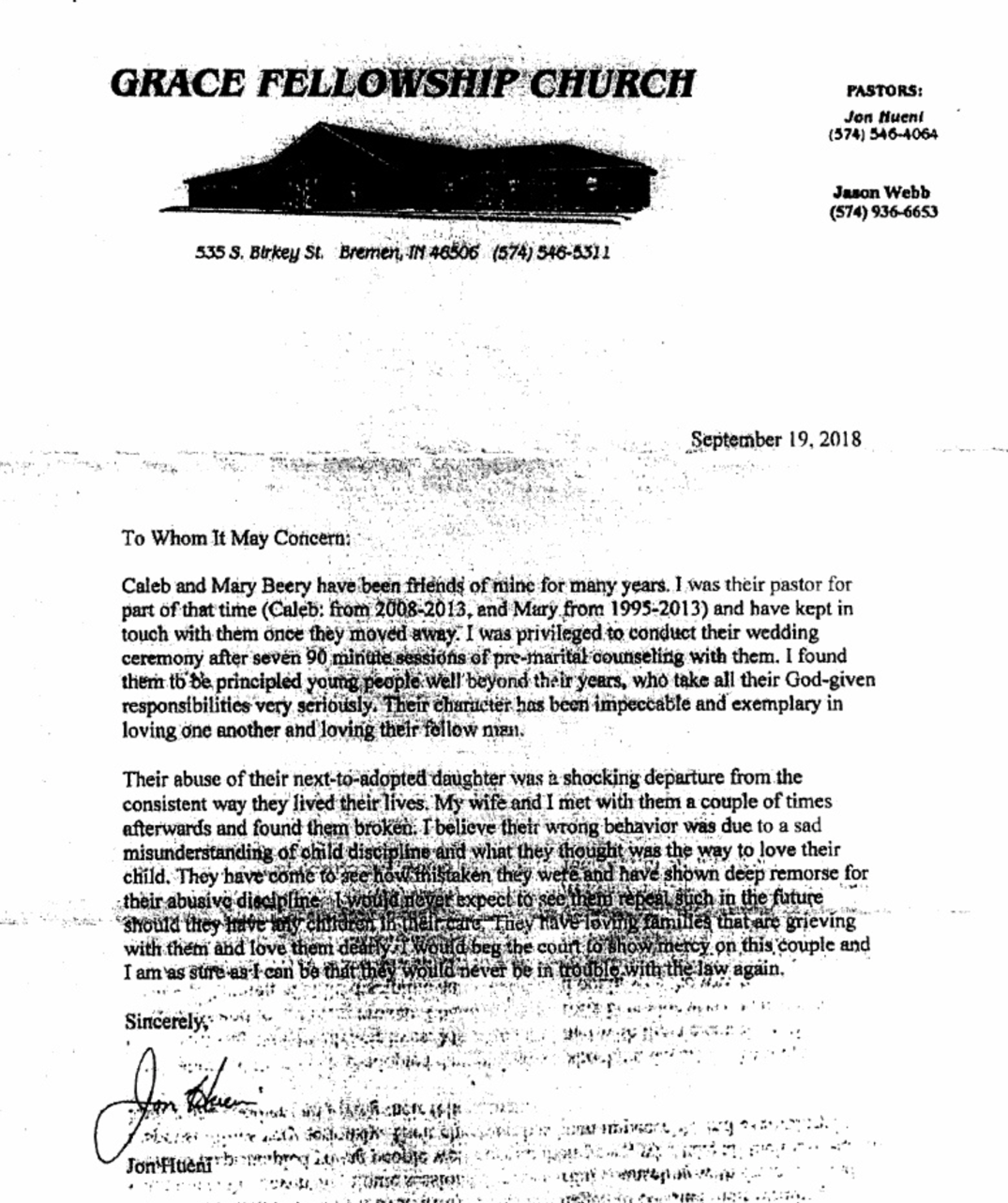Though Tripp was no longer connected with ARBCA, it seems his teachings may still have been influential in some ARBCA churches. Obviously, Tripp would never advocate the abuse which occurred in the Beerys case, but it’s concerning how some “zealous” individuals have carried the discipline of children to dangerous extremes. Additionally, it appears Tedd Tripp and pastor Jon Hueni are friends. Tripp thanked Hueni and his wife, Joann for their help while he was writing his book “Shepherding a Child’s Heart.” He mentioned them in the books Preface. It would be reasonable to think that Hueni agrees with the principles in Tripp’s book and may even use material from the book as he teaches his congregation about raising children. Why is this significant? Because Hueni is an ARBCA pastor in Bremen, Indiana and Mary Beery was raised in his church. Caleb Beery also attended his church for several years.