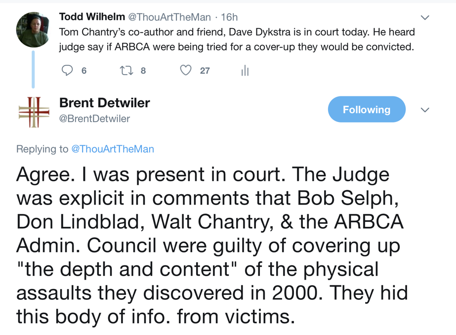 It would seem Providential that David Dykstra was in the courtroom this morning as he got to hear Judge Astrowsky state that if this were a trial of ARBCA cover-up they would be convicted.