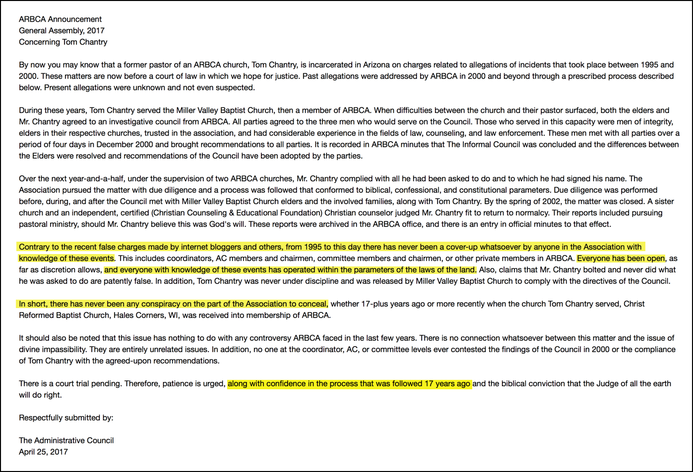 While it is not surprising that ARBCA is now trying to minimize what Thomas Chantry did back in 1995 to 2000 while he was the pastor at Miller Valley Baptist Church, it is quite frankly inexcusable that they are hiding facts they know to be true from its member churches. Even more appalling, Walt Chantry, Tom Lyons, Don Lindblad and other ranking members of ARBCA have for the past two decades, paved the road for Thomas Chantry to be in a number of positions (both as a pastor and a teacher) where he has had unfettered access to hundreds of vulnerable children. As a parent, wouldn’t you want to know such things before entrusting your child’s care to a man such as Thomas Chantry? As a member church, should you not expect more truthful reporting from the Association that you look to for guidance and dispute resolution? Perhaps everyone should ask ARBCA why for the past 18 years they have hidden the true facts about Thomas Chantry and why they continue to do so today.