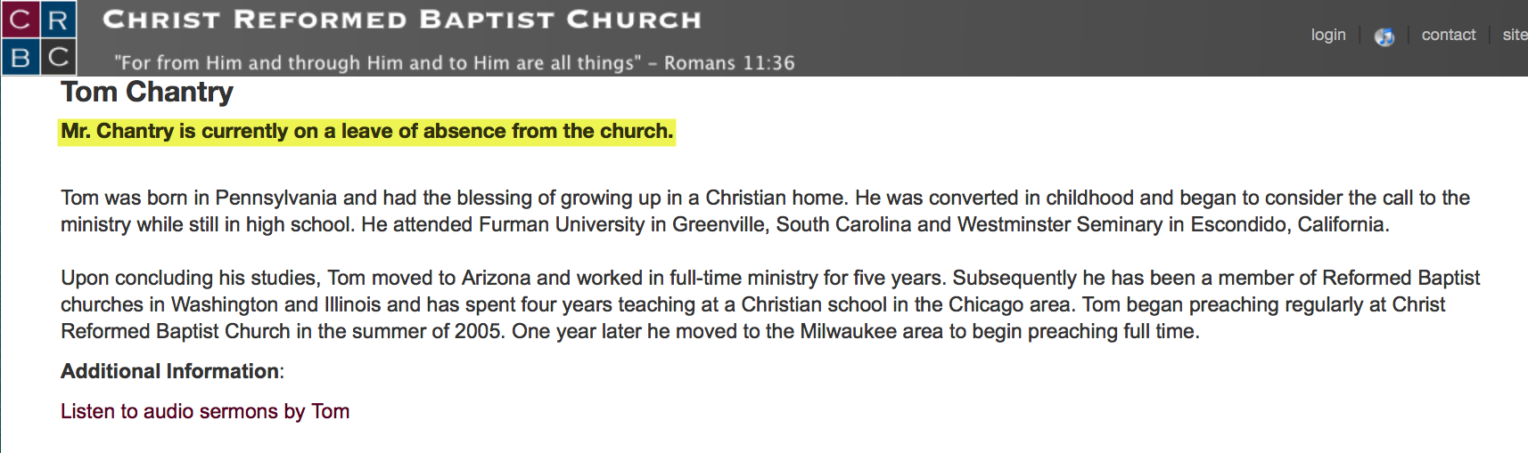 Prior to Tom Chantry going to MVBC, Tom was a member at TRBC [Trinity Reformed Baptist Church ] while Earl Blackburn was pastoring the church. While at TRBC, Tom taught a Sunday school class all alone with his favorite aged kids in a little room just he and the kids. The kids in Tom’s class didn’t like him. I remember one boy (now an adult) saying Tom was “weird” and gave him “the creeps.” For awhile (not sure if it was while he was attending seminary in Escondido or right after) he lived at Earl [Blackburn] and Debbie’s house and at times would babysit their son (who was 10-12 years old at the time) when they would go on vacation.