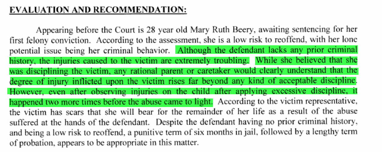 Trey would not have had access to the Presentence Investigation report as it wasn’t filed with the court until October 10th. If he would have had the report he would have known that the infant victim’s new adoptive parents said their child was burned and has scars that will remain for the rest of her life, and that the professional medical staff stated that the infants injuries were consistent with someone who had been dipped in scalding hot water rather than spanked with a spatula. As the evaluation below states, “the injuries caused to the victim are extremely troubling.”