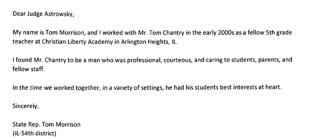 “Morrison said Thursday he provided the three-sentence letter — in which he identifies himself as an Illinois state representative — to Chantry’s defense attorney via email on Sept. 10. Morrison said people he knows from Christian Liberty encouraged him to send a letter on Chantry’s behalf.”
