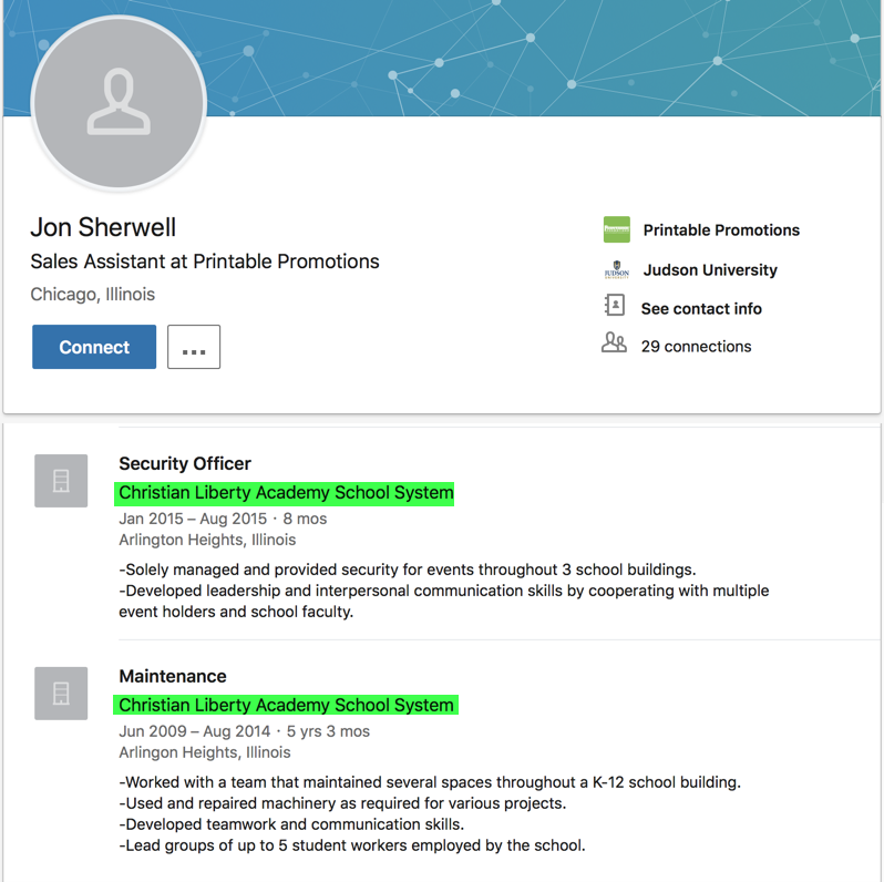 “Christian Liberty Academy plays an important role in Morrison’s life. Along with being a 5th grade teacher there for six years, his parents had helped found the school in 1969. Chantry taught there from 2002 to 2006.