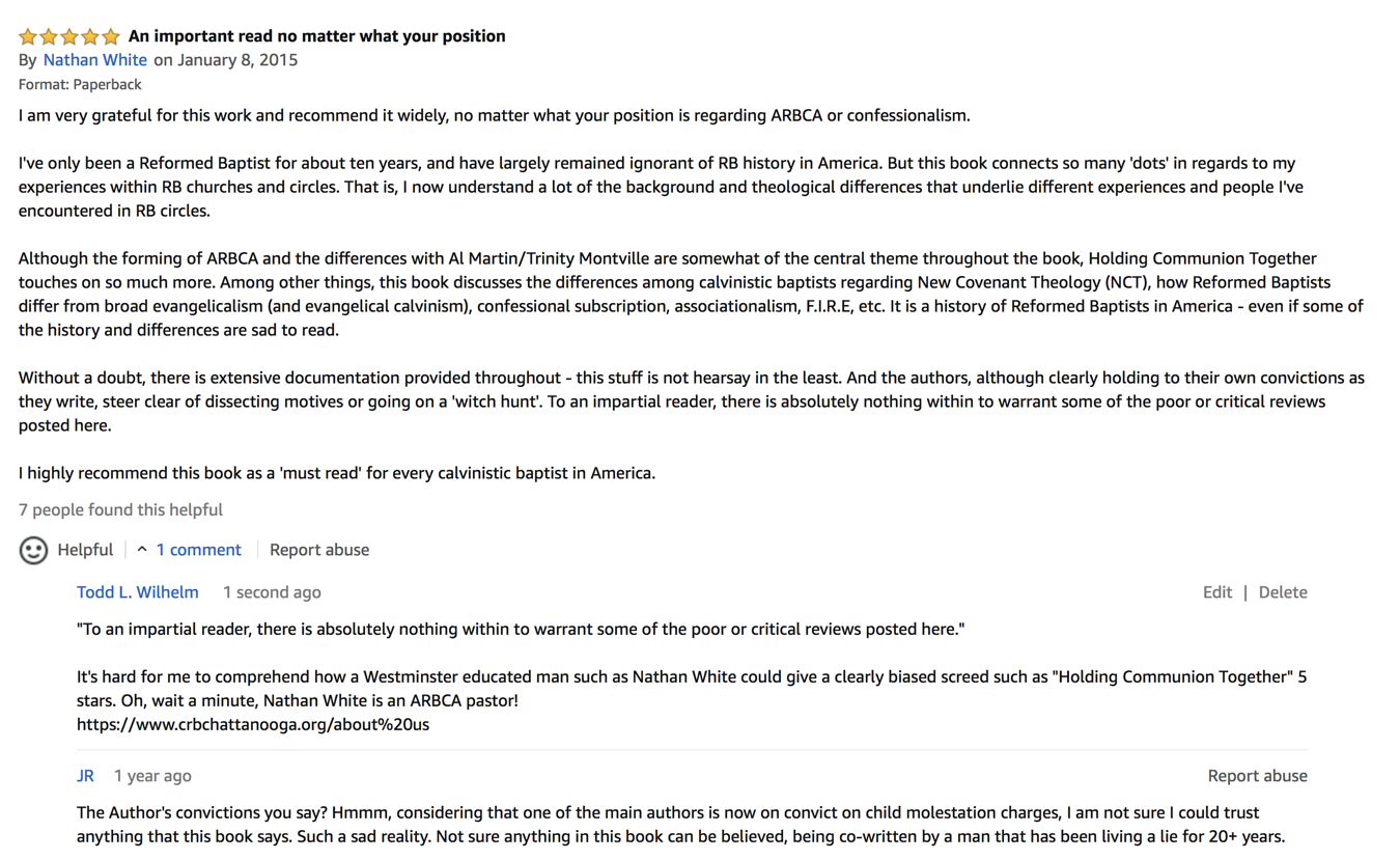 Below is a screenshot of Nathan White’s review and a comment I made in response to his review. I had taken this screenshot because I plan on writing about all the ARBCA leaders who have submitted positive reviews of this book. Included in this group are Al Huber and Steve Martin.
