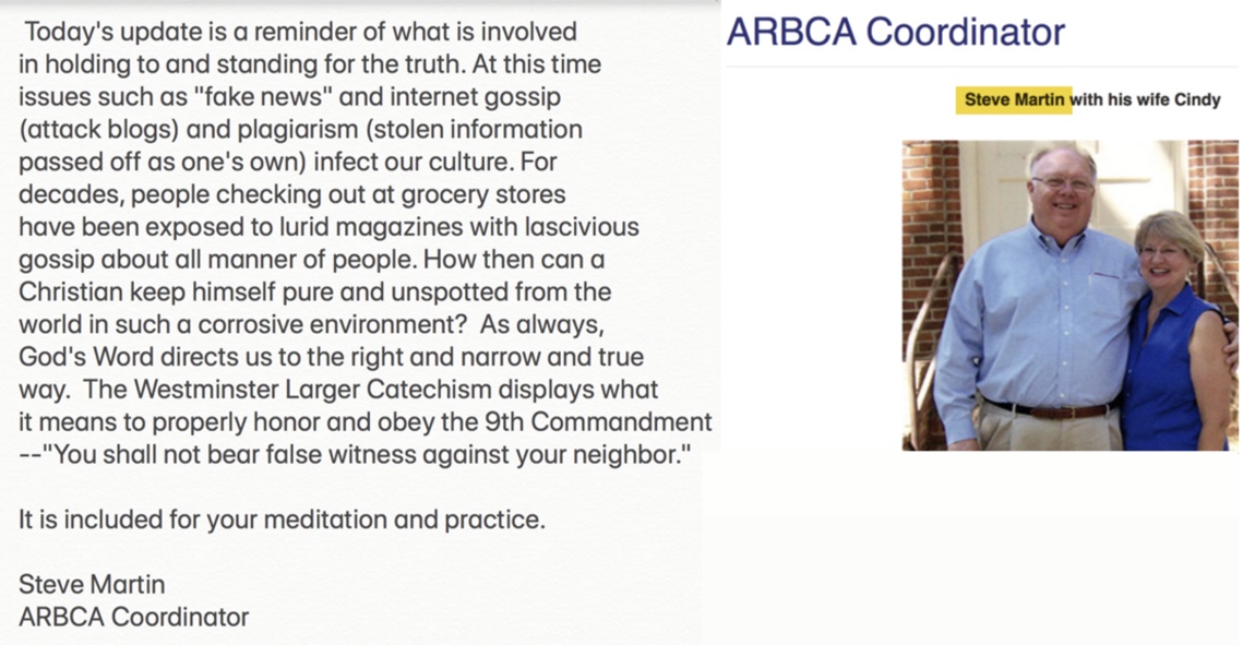 This letter is in line with similar communications I have been made aware of by ARBCA officials. (If any members of ARBCA churches have received similar emails from their pastor I would be happy to publish them without your names listed. My email can be found in the “About Todd and his team” tab at the top of the page.)