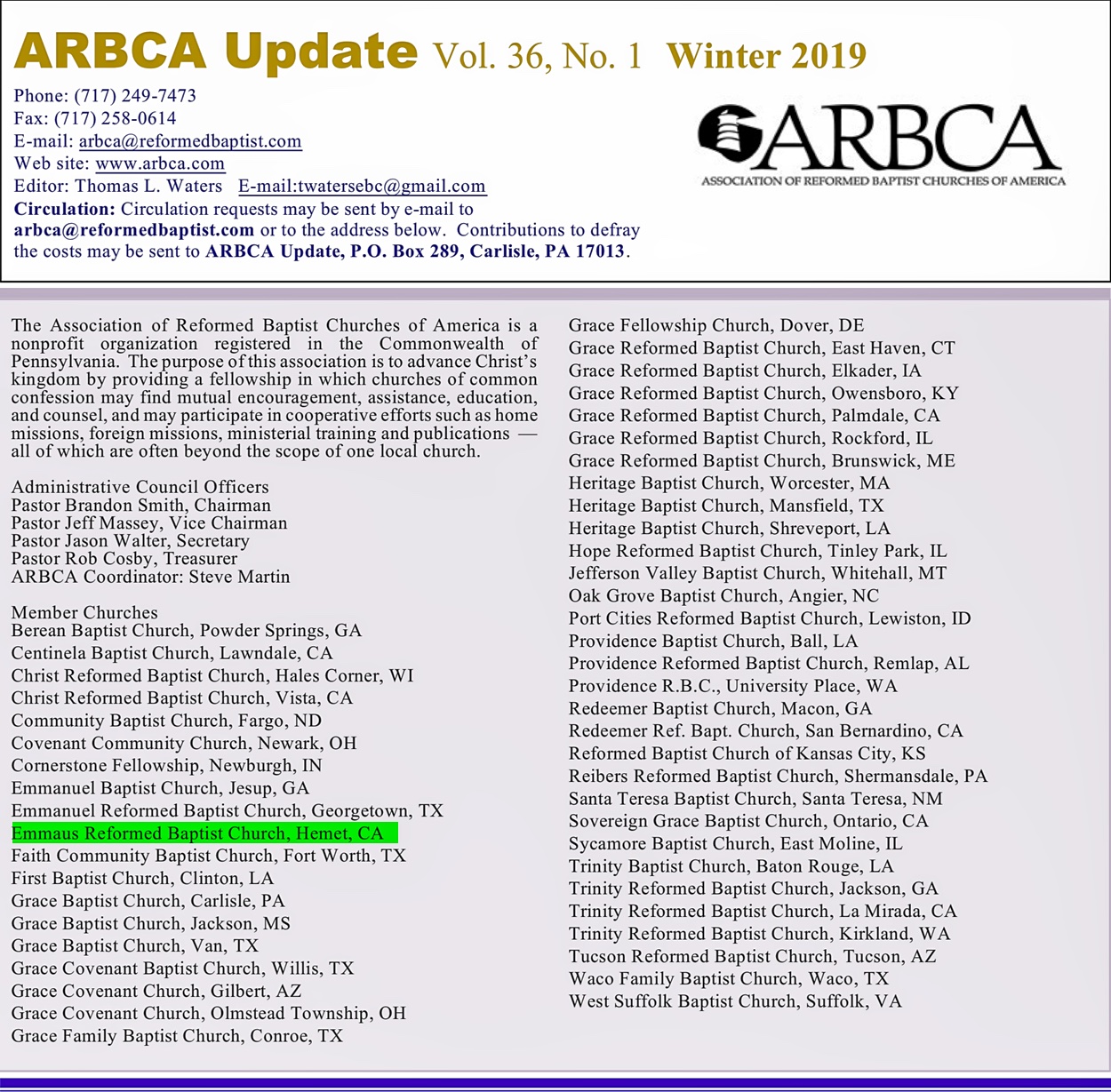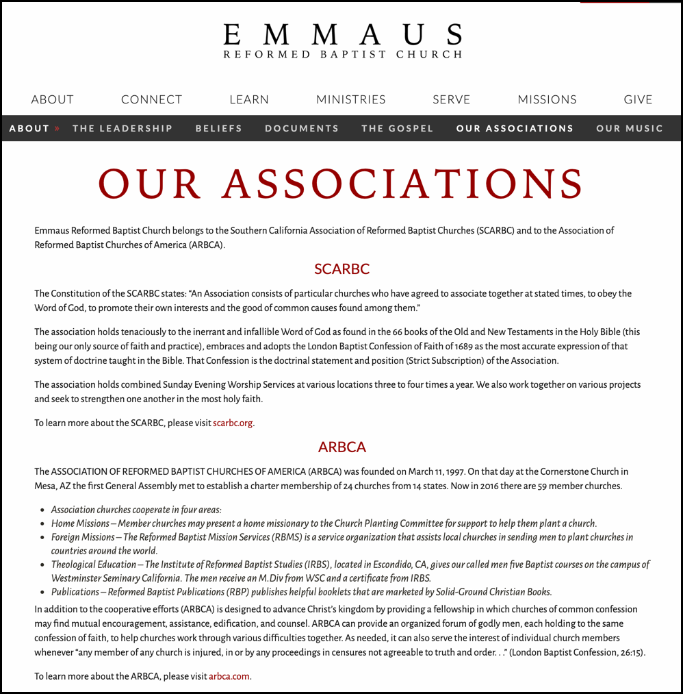 Below is a screenshot showing Emmaus Reformed Baptist Church as a member of ARBCA.