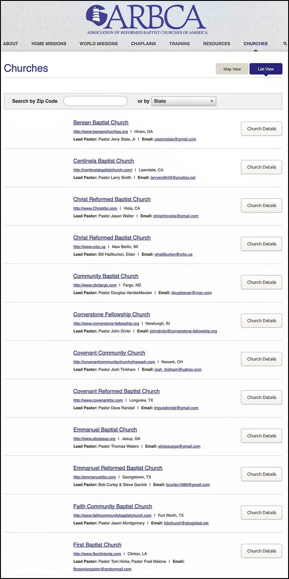 Below is the list of churches from the ARBCA website. This screenshot was taken on June 6, 2019 and Emmaus Reformed Baptist Church is no longer listed.