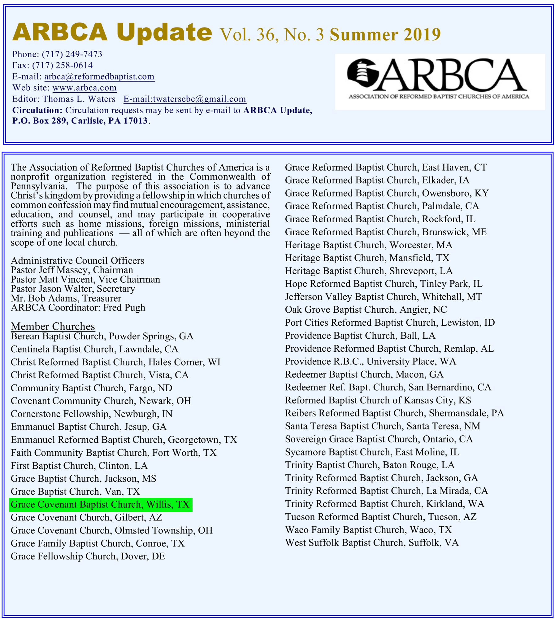 ARBCA recently published their Summer 2019 newsletter. In this document, seen below, please note that Grace Covenant Baptist Church, located in Willis, Texas and pastored by David Dykstra is still listed as an ARBCA member.