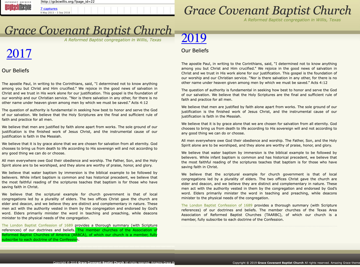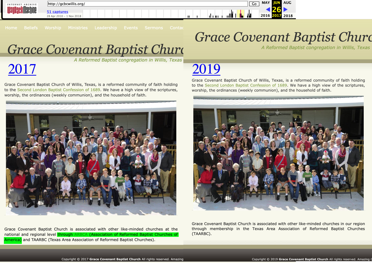 I submit two examples of this below. On the left are pages from the church’s website in 2017, courtesy of the Wayback Machine. On the right are pages from the church’s website today. You will notice that the references to ARBCA in 2017, which I highlighted in green, no longer exist in today’s version!
