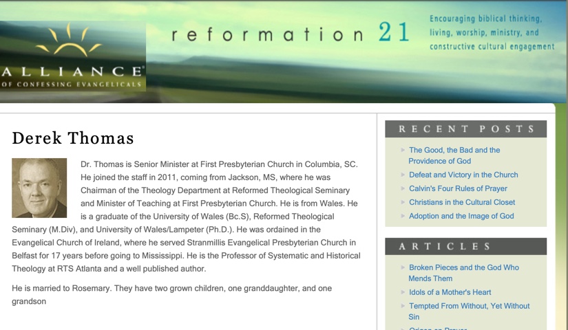 Who is Dr. Derek W.H. Thomas? Although Dr. Thomas no longer works for the Alliance of Confessing Evangelicals, below is a good biography of him I found on their website.