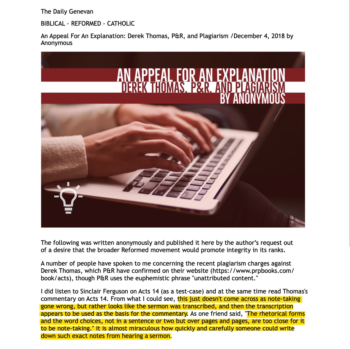 In December 2018 the Daily Genevan blog published an article by an anonymous author on Dr. Derek W.H. Thomas, specifically his rampant plagiarism of Sinclair Ferguson in a commentary on Acts authored (more or less) by Dr. Thomas.