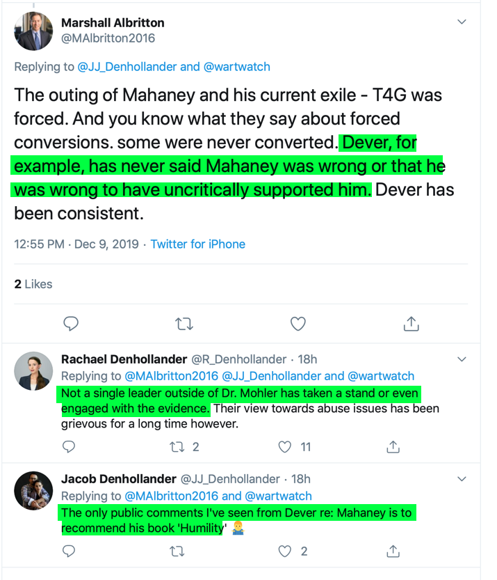 Portions of the statement referred to in the screenshot above are included below. It should be noted that Dr. Mohler is the only individual to have retracted his statement of support for C.J. Mahaney. Mark Dever and Ligon Duncan have, not surprisingly, remained quiet on the subject. As the saying goes: actions speak louder than words. Dever and Duncan are fine public orators but just can’t seem to apologize for supporting a man who has covered up the sexual abuse of children in the denomination he once led.