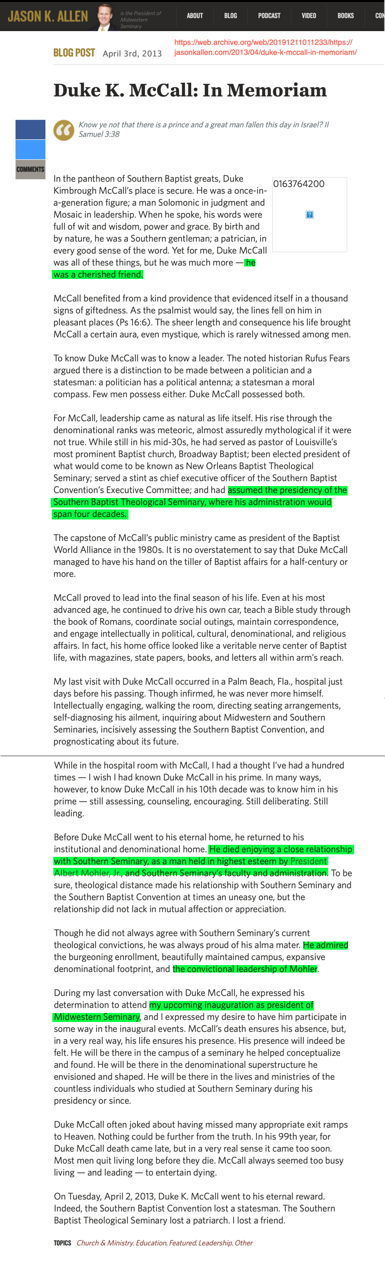 Jason K. Allen, the President of the Midwestern Baptist Seminary, said in the article below that Duke K. McCall was a cherished friend. Allen also said McCall maintained a close relationship with Southern Seminary and that Al Mohler, Southern Seminaries faculty and administration all held McCall in “highest esteem.” In Allen’s Memoriam about the only thing it sounds like McCall didn’t do was walk on water. Call me a cynic, but can there be any doubt Allen is hopeful that McCall’s family will funnel a little of their wealth to the Seminary he presides over?