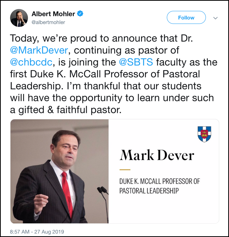 This leads me to the subject of my blog today.  In August Dr. Mohler announced that his good friend, Mark Dever has been appointed as the “first Duke K. McCall Professor of Pastoral Leadership.”