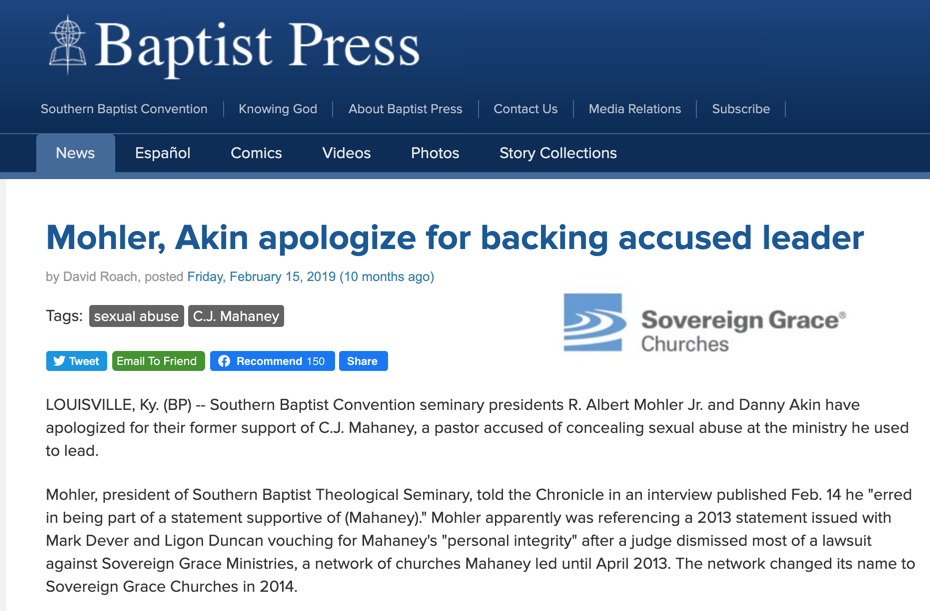 I was thrilled to hear that in February of this year Dr. Mohler, after speaking at length with Rachael Denhollander, a well-known advocate for victims of sexual abuse, realized his error in supporting C.J. Mahaney and Sovereign Grace Churches and, along with Danny Akin, made a public apology for their actions. You may recall that Mahaney, Sovereign Grace Ministries, and Covenant Life Church combined to donate over $200,000 to SBTS.