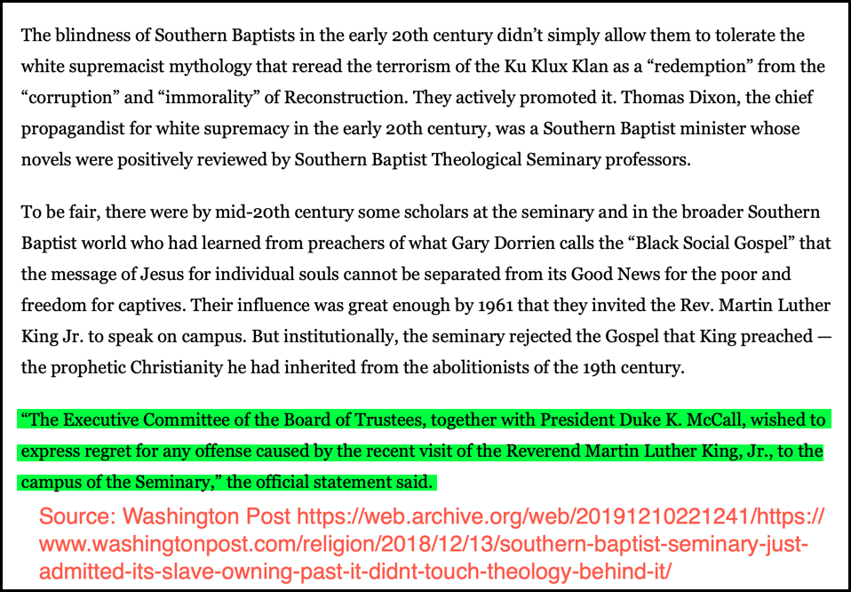 Seminary president, Duke McCall, soon issued an apology. “The Executive Committee of theBoard of Trustees, together with President Duke K. McCall, wishes to express regret for any offense caused by the recent visit of the Reverend Martin Luther King, Jr., to the campus of the Seminary.”