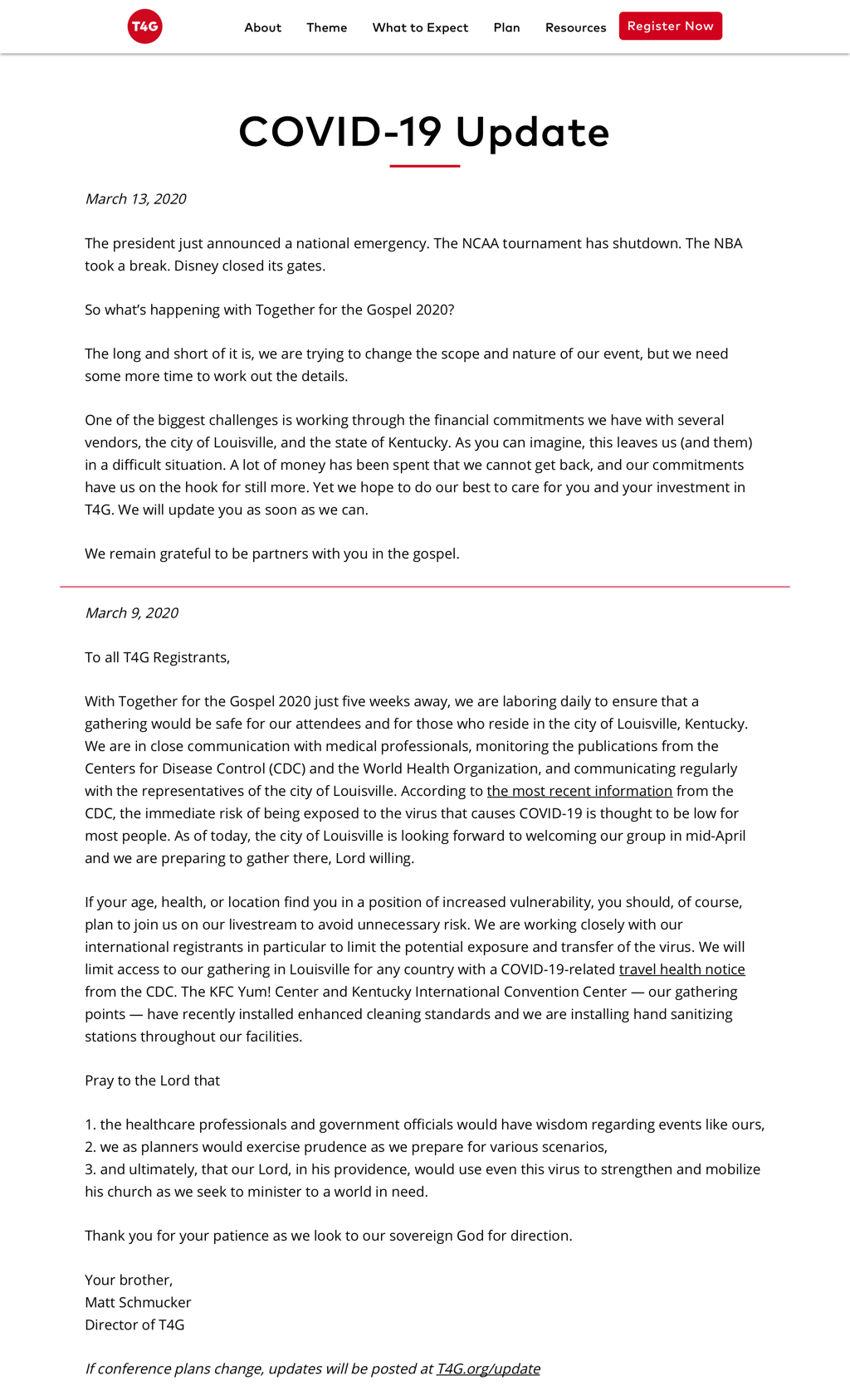 I fully expect the T4G Gospelly boys to announce they are cancelling their conference any day now, but it’s rather shameful that the Governor of Kentucky may have to threaten the leaders with house arrest if they refuse to do so!