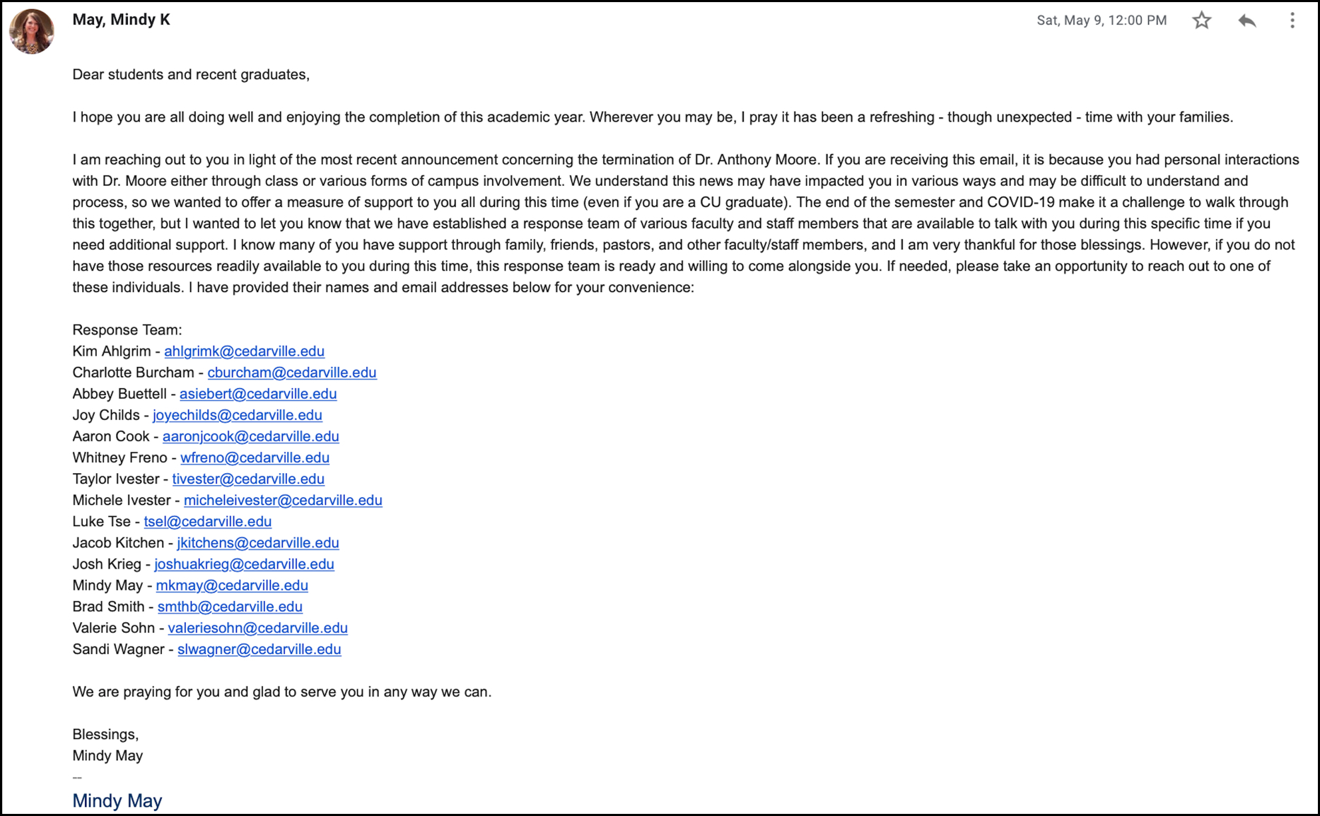 With that said, and admitting I know nothing of anyone on Mindy May’s “Response Team” except Mindy May, I feel comfortable in warning anyone thinking of allowing anyone on the “Response Team” to serve you to think again. You will not benefit from allowing anyone on CU staff to “walk through this together” with you. I would recommend seeking help from a professional counselor and a private attorney.