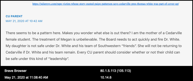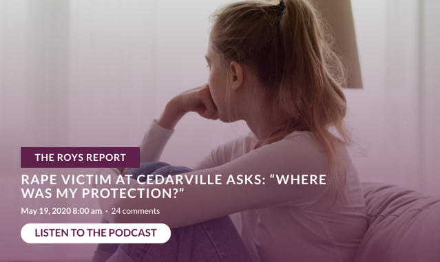 Julie Roy also had an excellent interview with a woman who is now a former student at Cedarville University. This woman related what was an ongoing nightmare of sexual harassment and rape while a student at CU. If you have not listened to the podcast you can find it here.