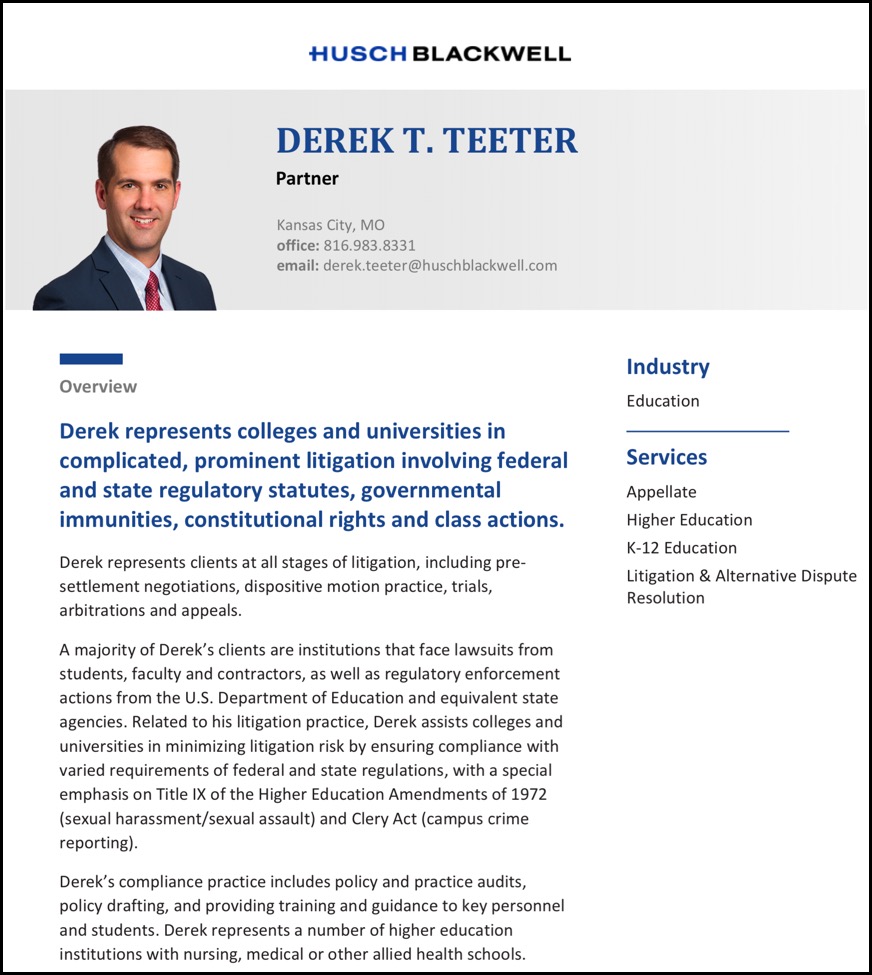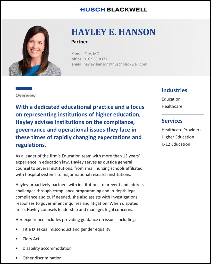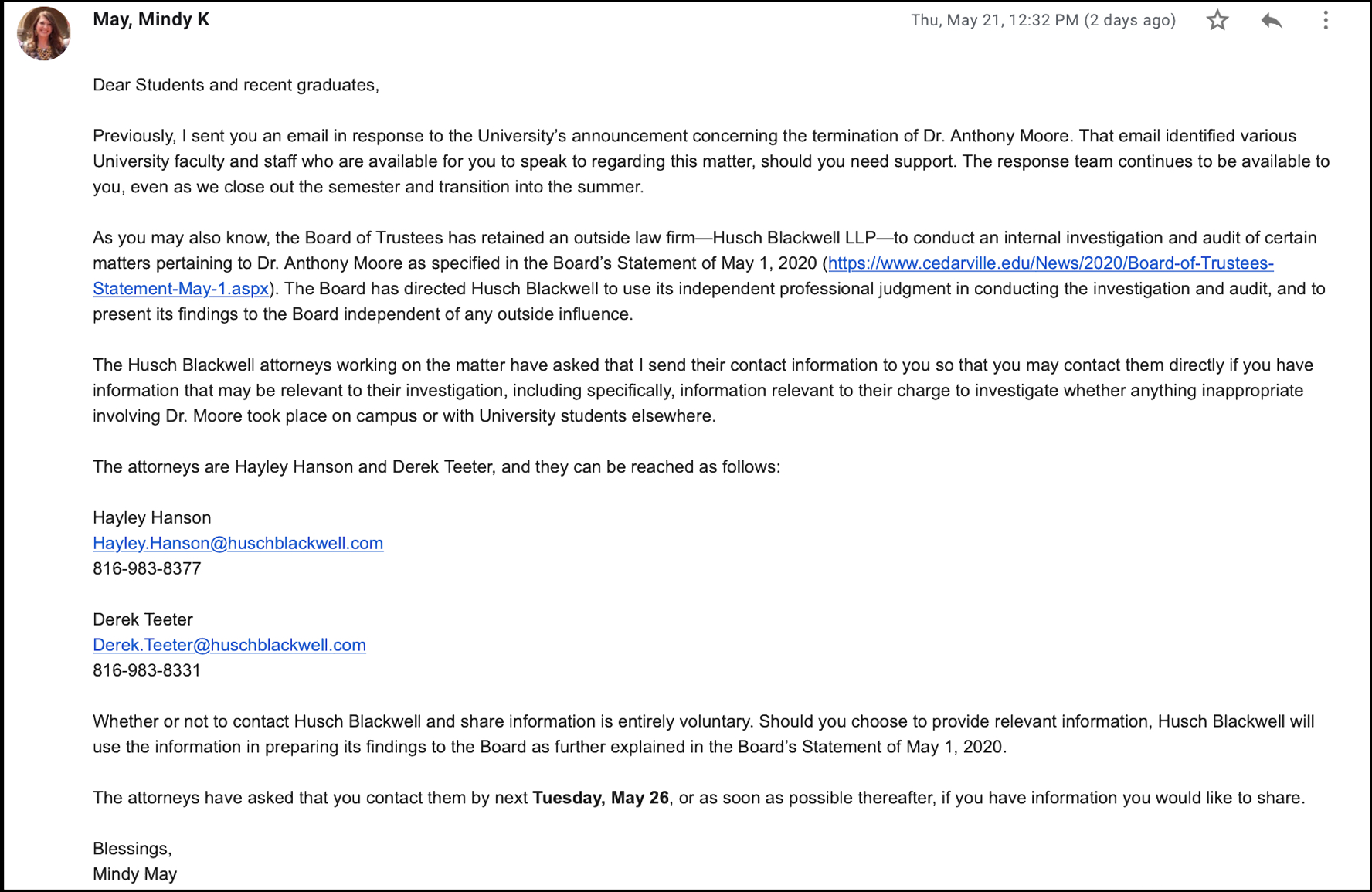 Below are the bio’s of the two attorneys from Husch Blackwell that are conducting the internal investigation for Cedarville University. Note they both mention they represent colleges and universities or institutions of higher education. That would necessarily mean they do not represent you! Attorneys represent the person or entity that is paying them. If you want to be represented, hire an attorney, and have your attorney accompany you into any meeting you have with Mr. Teeter or Ms. Hanson. But if you do wish to speak with them you better act quickly. Today is the 23rd of May, and according to Mindy May the attorneys would like to have this wrapped up by May 26th!