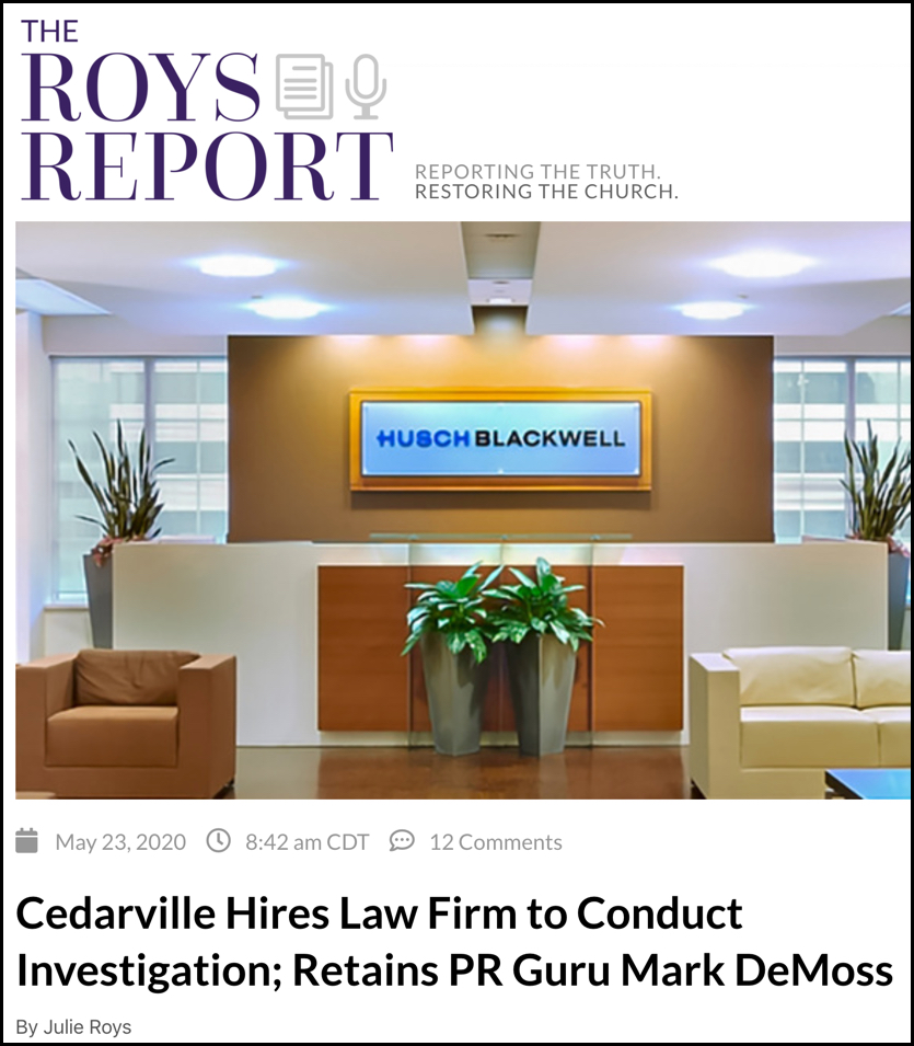Julie Roys published a good article today on the law firm hired by Cedarville University which can be read here. Roys spoke with Boz Tchividjian who explained the difference between an internal investigation and an independent investigation. In a nutshell, internal investigations are beneficial to the institution who has hired the law firm, independent investigations are beneficial to those outside of the institution who desire to learn the truth about a matter.