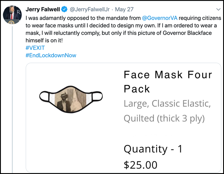 “Faced with outrage from black alumni and the resignation of at least three African American staffers, Liberty University President Jerry Falwell Jr. has deleted and apologized for a two-week-old tweet that showed a face mask decorated with a photo of a person in Ku Klux Klan robes and another in blackface.