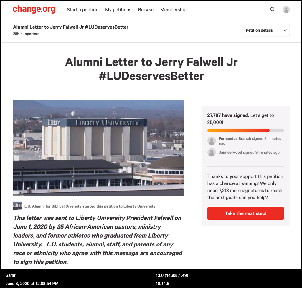 The tweet triggered 35 Africa-American pastors who are graduates of Liberty University to send a strong letter of protest to Jerry Falwell Jr. In addition to that, a petition calling for Falwell’s resignation has been initiated and has garnered over 28,000 signatures to date.