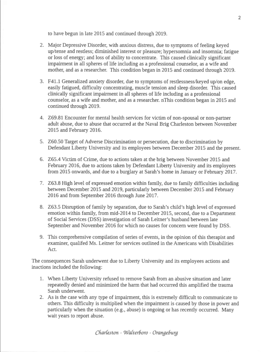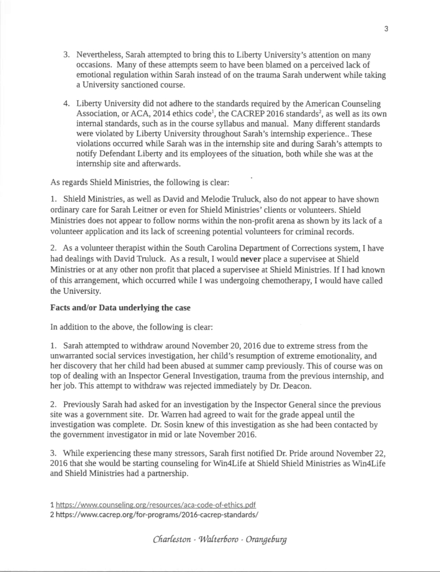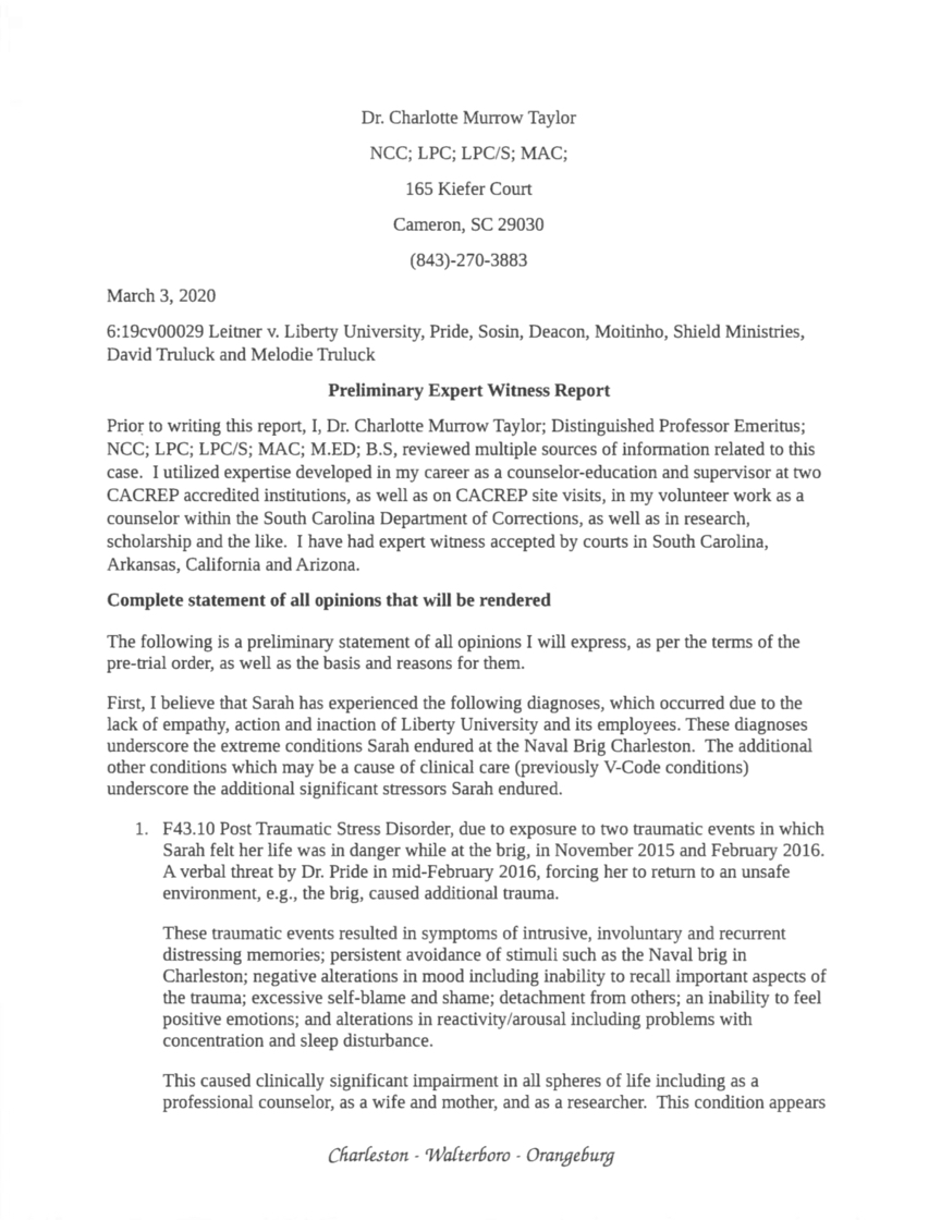 At this point, Sarah’s only option available to obtain an equitable outcome to her unfair treatment at the hands of Liberty University was to file a lawsuit. To this end, she enlisted the help of an Expert Witness, Dr. Charlotte Murrow Taylor. Dr. Taylor wrote an excellent report, the contents of which leaves one incredulous at the treatment Sarah received from Liberty University.